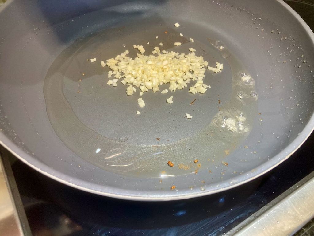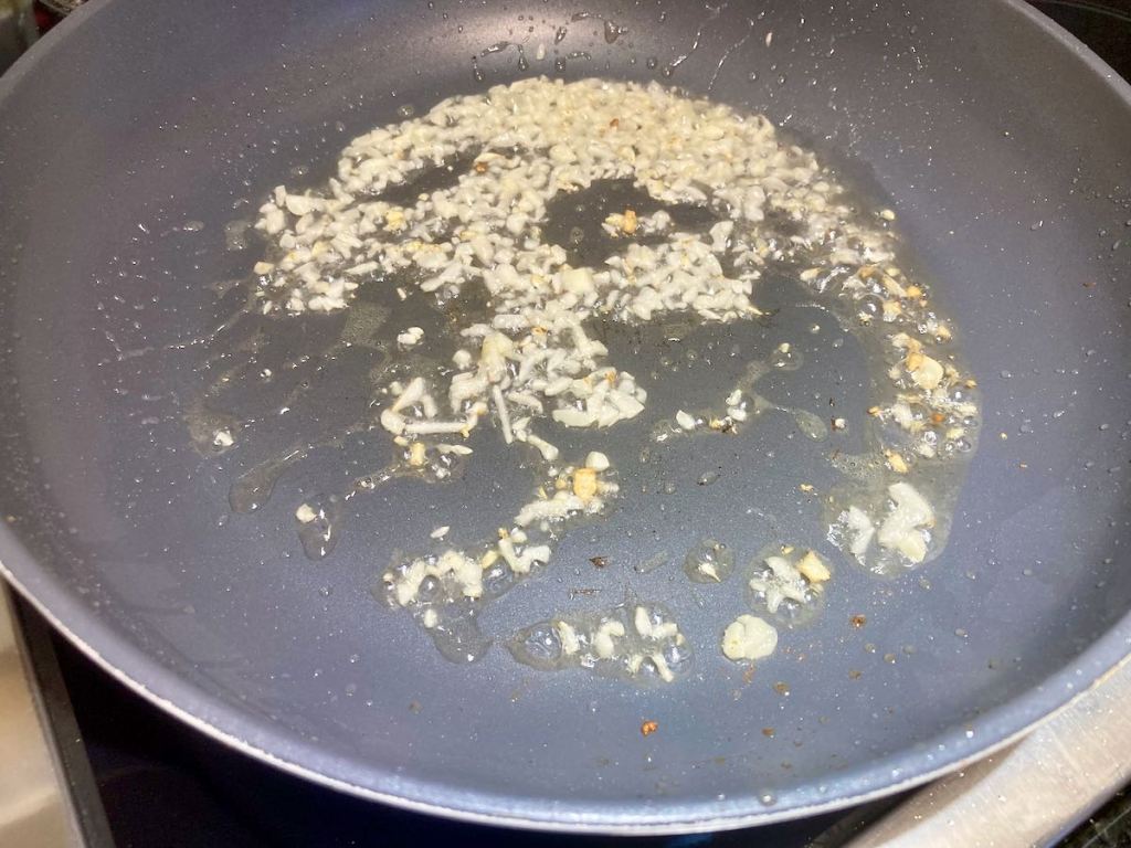 - Place a frying pan on medium-high heat with the olive oil and garlic.
