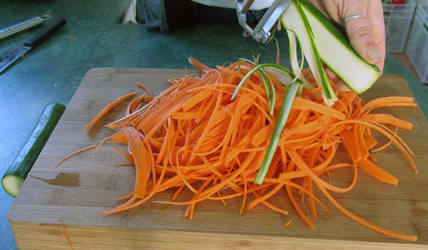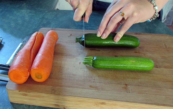 - Take the top and bottom off the carrots and courgettes with a sharp knife.