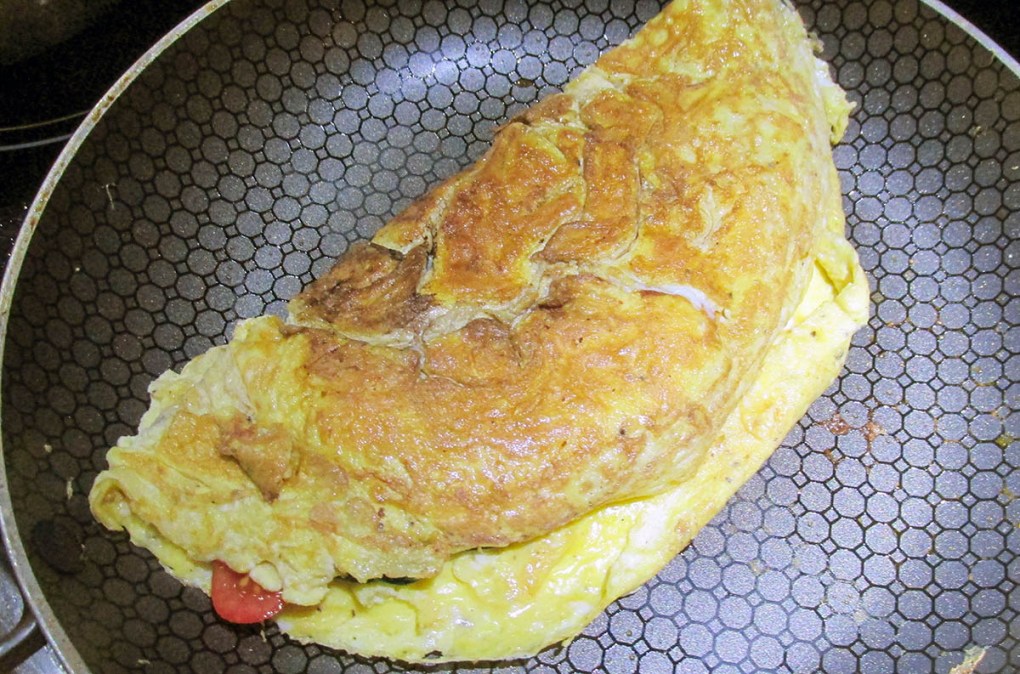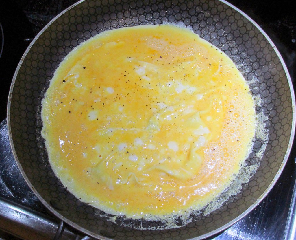 - When the butter has melted, and the pan is hot pour in the eggs, make sure they are evenly spread in the pan.