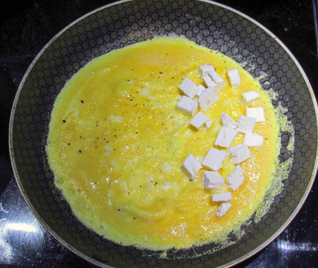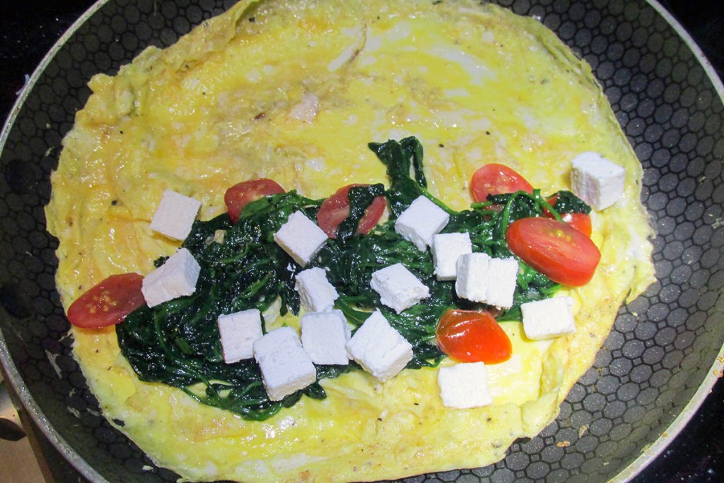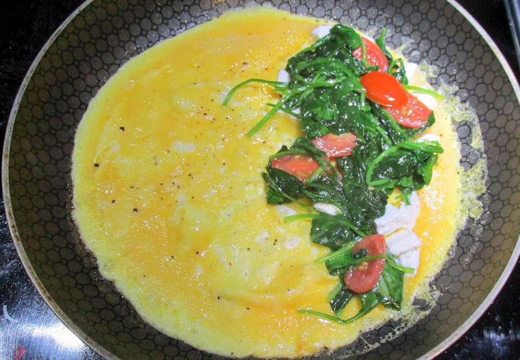 - Add the goat cheese, tomato and spinach to one side of the omelette.
