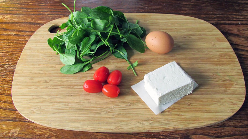 We currently have a vegetable bed bursting with baby spinach; this recipe is an excellent and easy way to use the abundance of green in the garden while making a simple and tasty meal. A quick dash out to the garden is enough to make a filling and fresh breakfast.