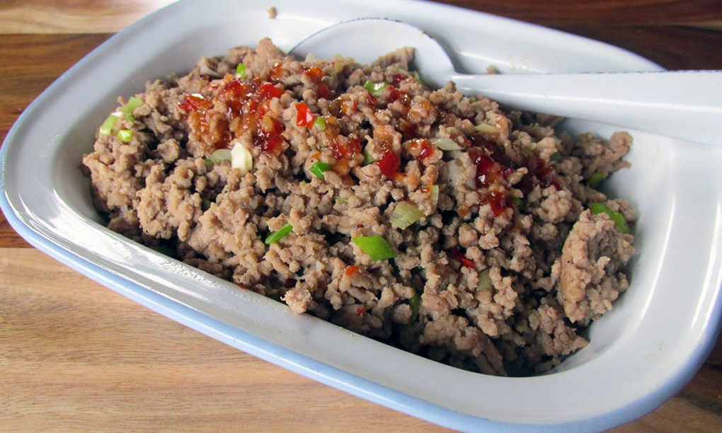 - In a large frying pan heat some oil and add the minced pork to the pan.