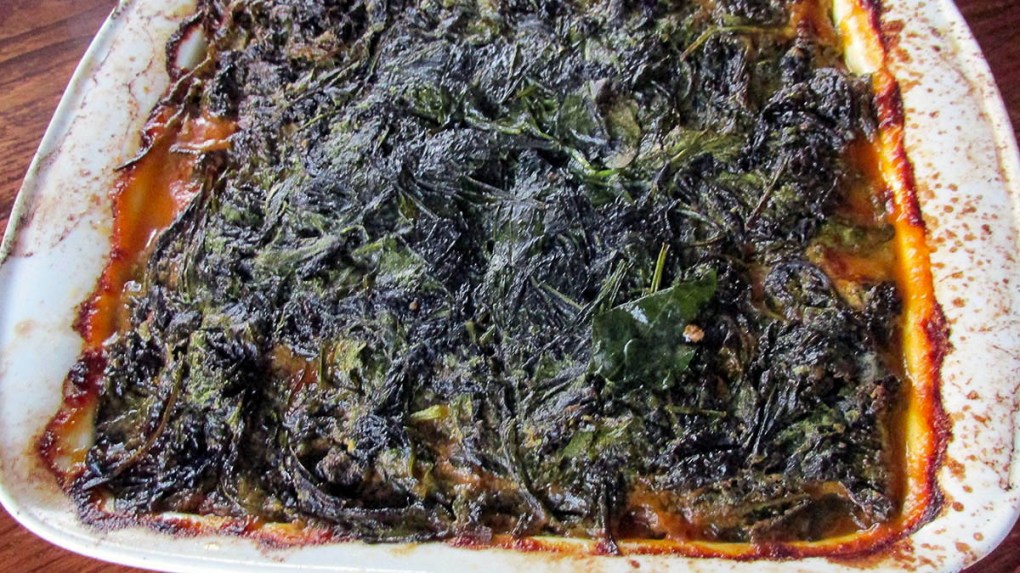 Take the baking dish and layer up the casserole, starting with beef, then the mashed sweet potato and top with the kale.