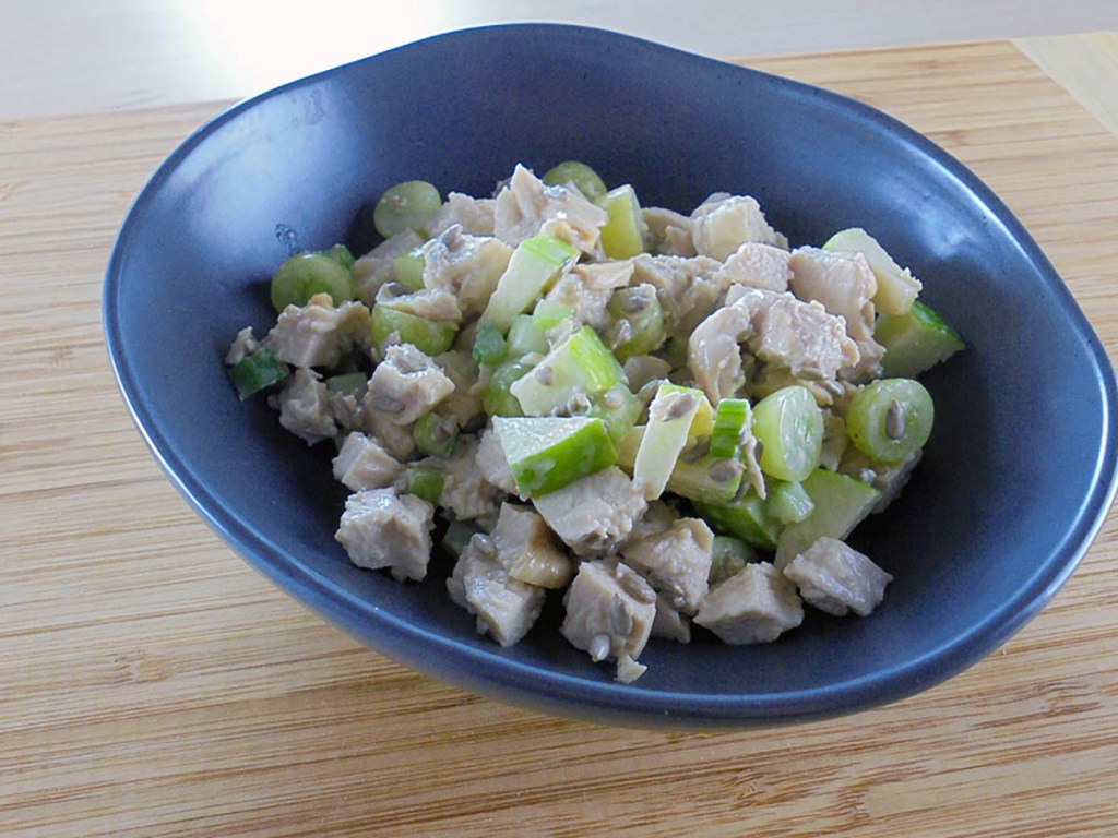- In a bowl, combine chicken, apple, celery, and seeds.
