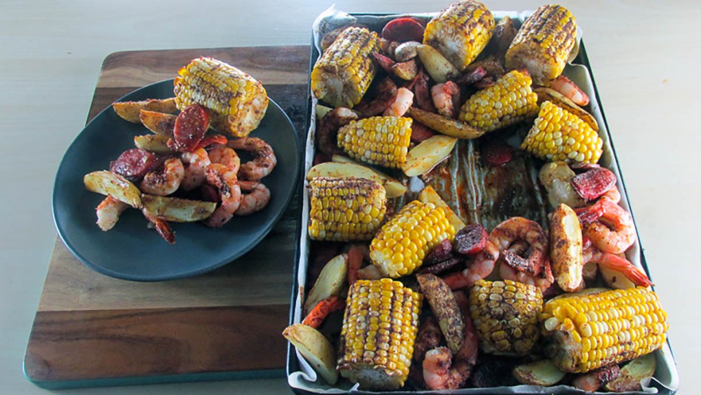 - Spread the Cajun seasoning mix over the corn, potatoes, prawns and chorizo.
