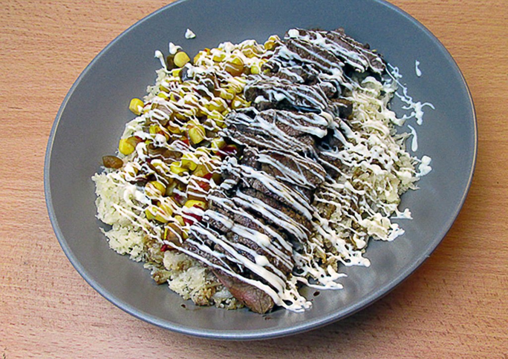 - Plate up the cauliflower rice, top with the vegetables and the sliced steak, serve with some easy mayo on top.