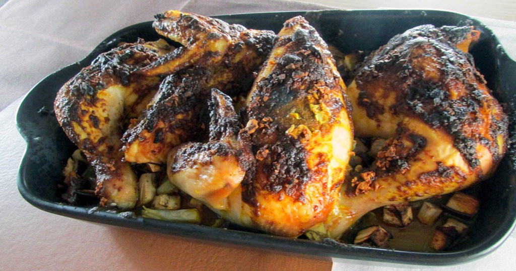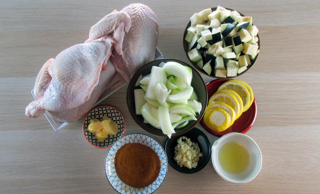 –3/4 tsp. salt –1/4 tsp. ground cumin –3/4 tsp. paprika –3/4 tsp. turmeric –1/4 tsp. ground cayenne pepper –1/4 tsp. –1 tbsp. olive oil –1 tbsp. butter –4 garlic cloves, minced –1 lemon –1 aubergine, cubed –2 onions, cut into wedges –1 chicken, quarteredDirections