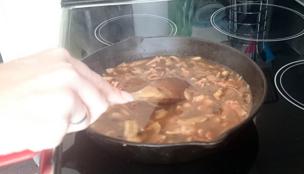 - When the chicken is browned off add in the chicken stock and simmer until the stock has thickened.