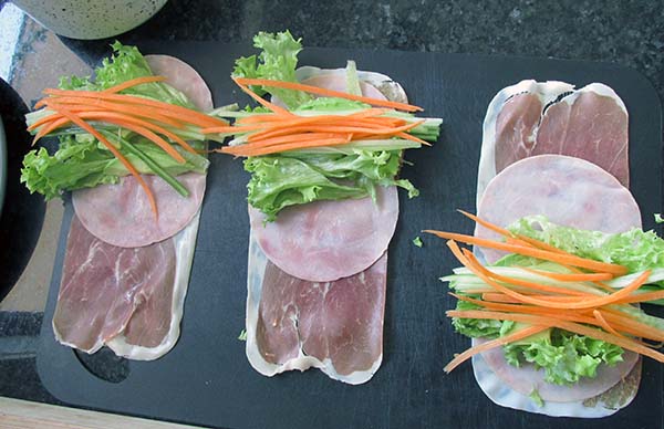 - Starting at the end with the salad roll the meat up to create a roll.