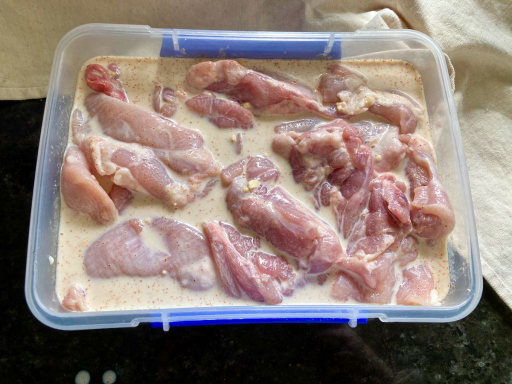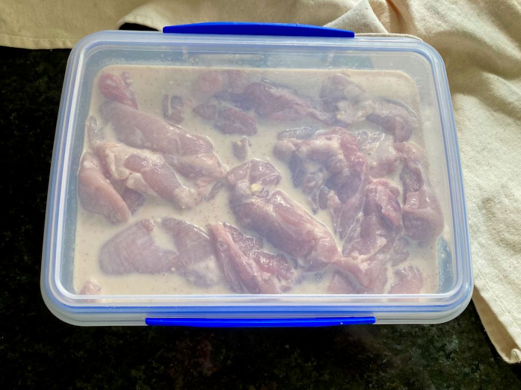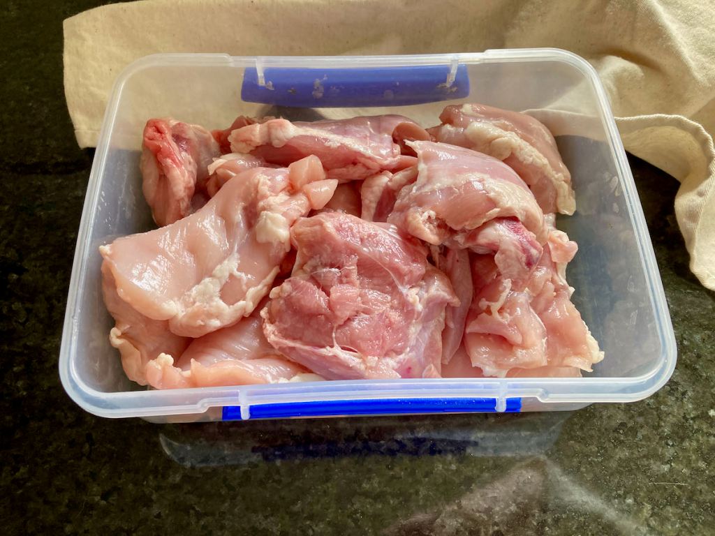 - When you are ready to use the chicken, remove the bowl or tub from the fridge.