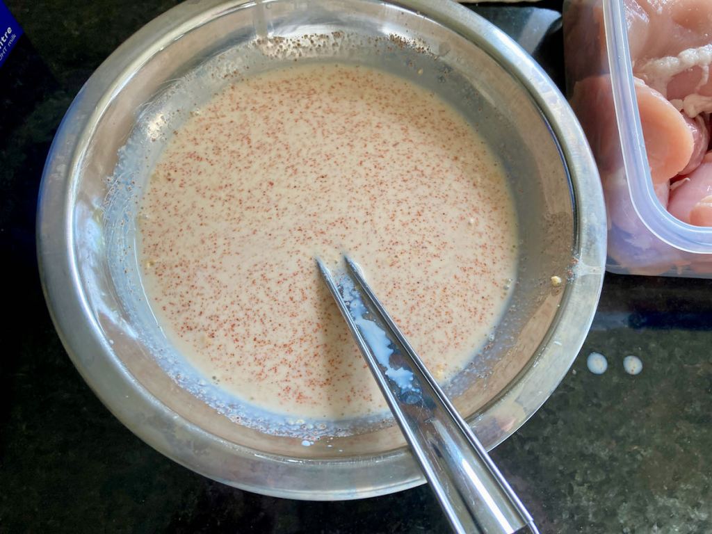 - In a bowl, whisk together the milk, paprika and garlic powder.