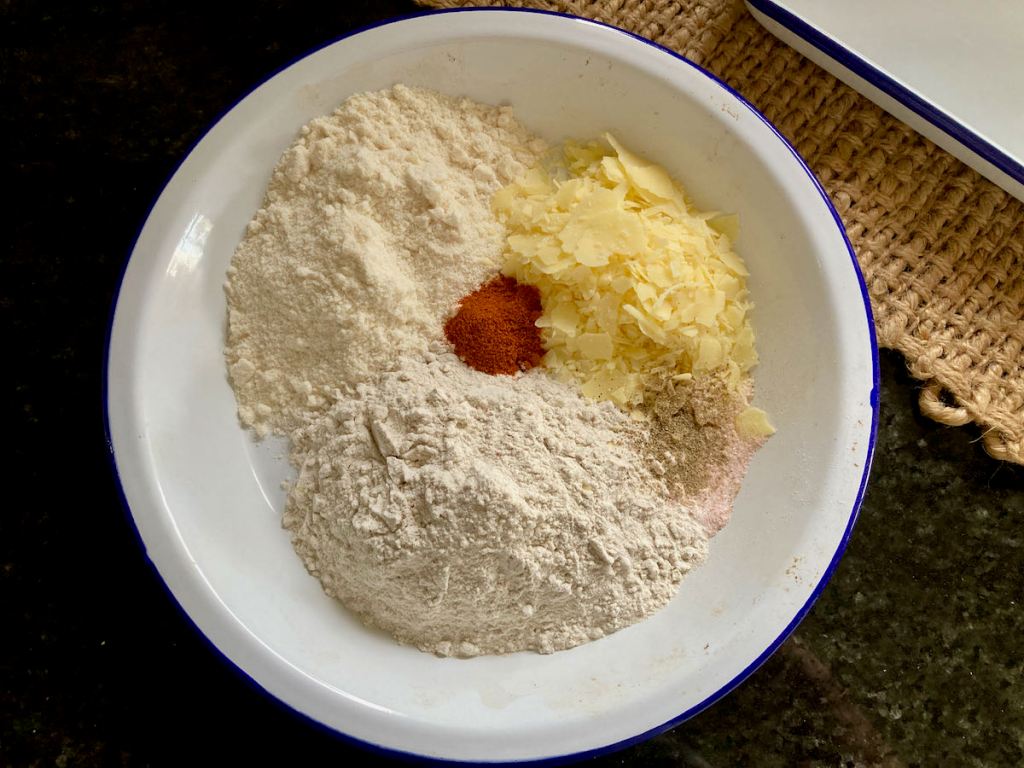 - On a plate with tall sides or a bowl, mix together the coconut flour, buckwheat flour, parmesan cheese, paprika, salt and pepper.