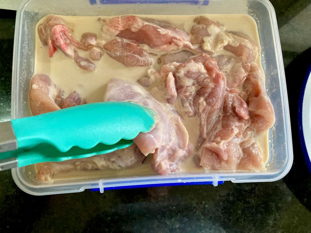 - Pour the milk over the chicken thighs.