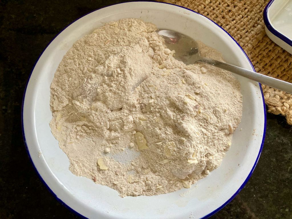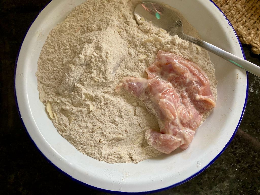 Spoon the flour over the chicken, making sure to coat the chicken thoroughly.