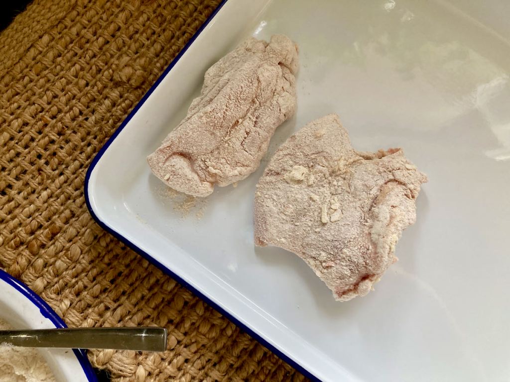 - Lightly shake the excess flour off the chicken and place the chicken on a baking sheet to rest.