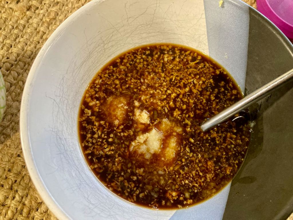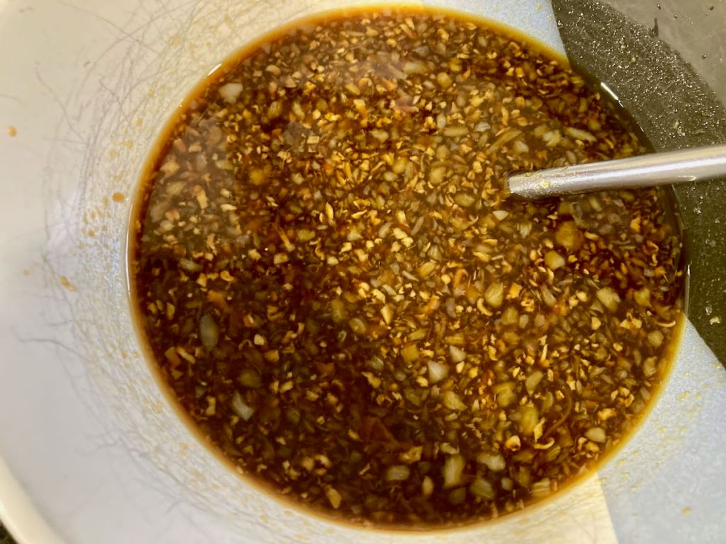 - In a bowl, whisk together the coconut aminos, honey, garlic cloves, ginger, and vinegar then set aside.