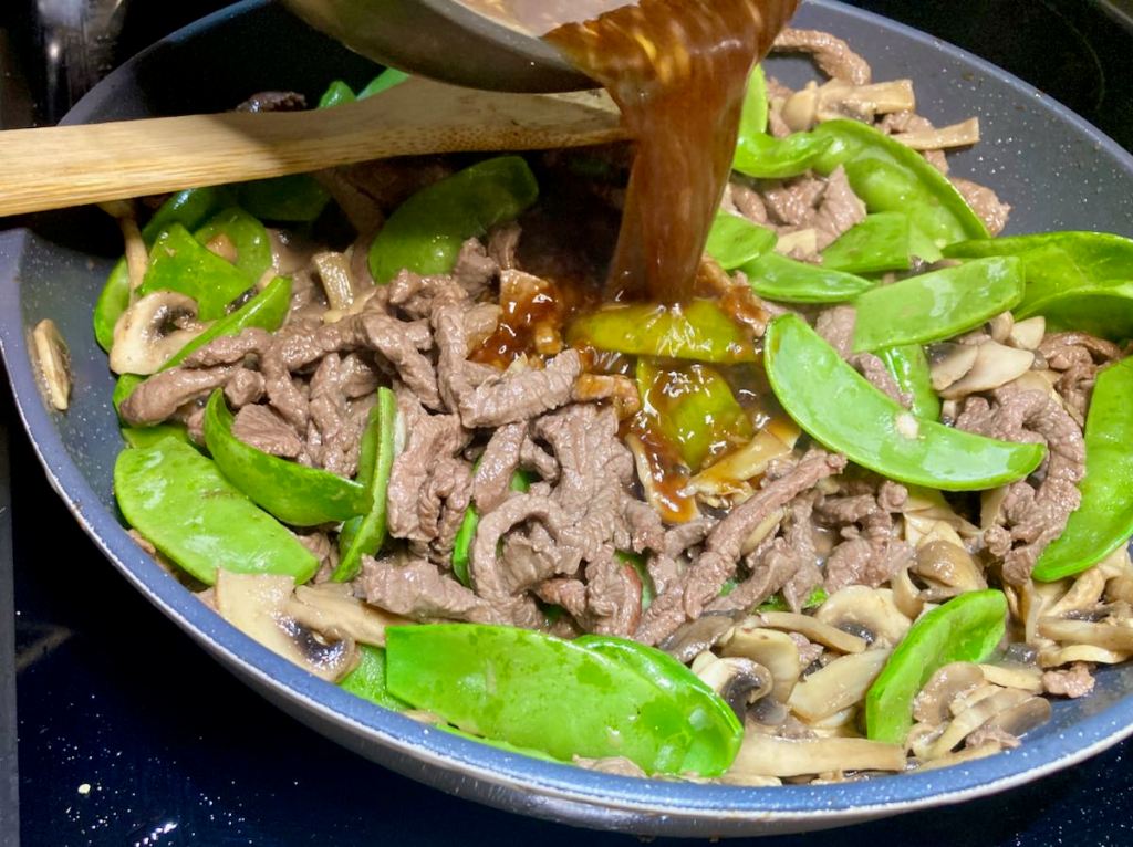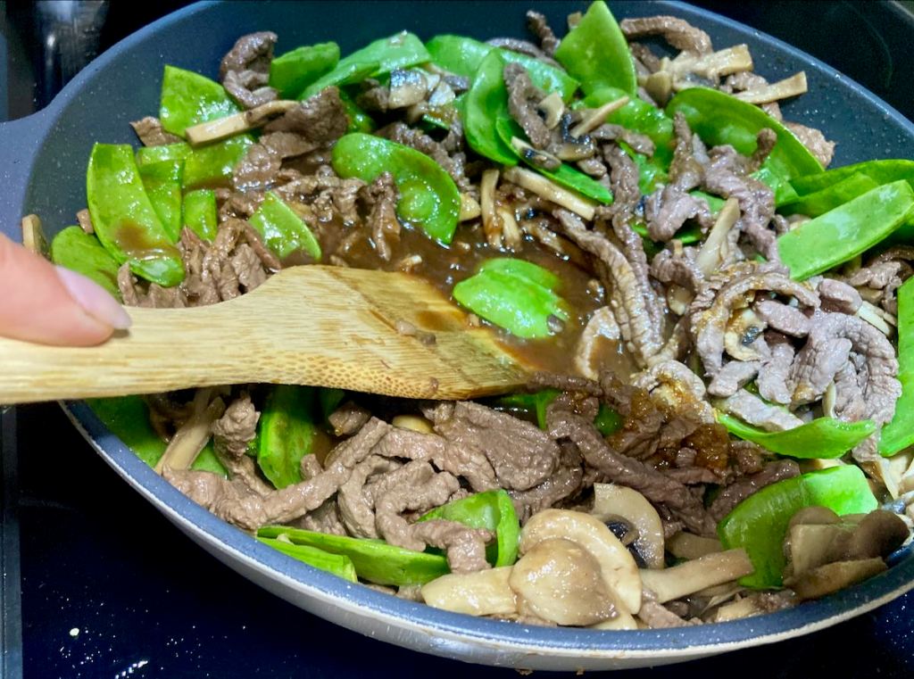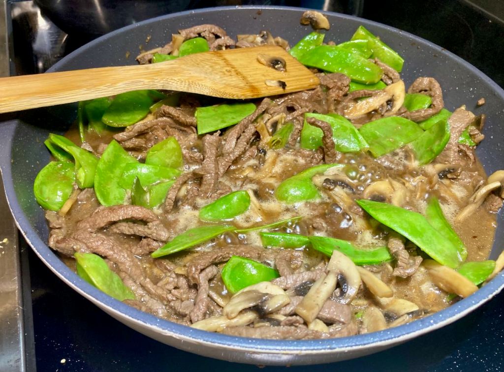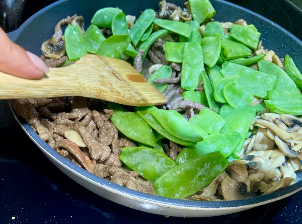 - Add all of the meat, mushrooms, and snow peas to the pan with the sauce.