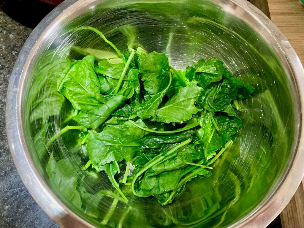 Remove the wilted kale from the basket and chop it roughly.