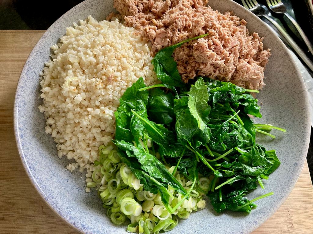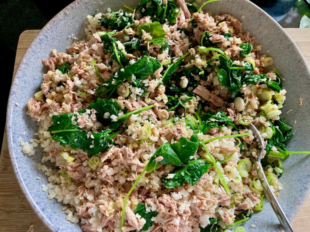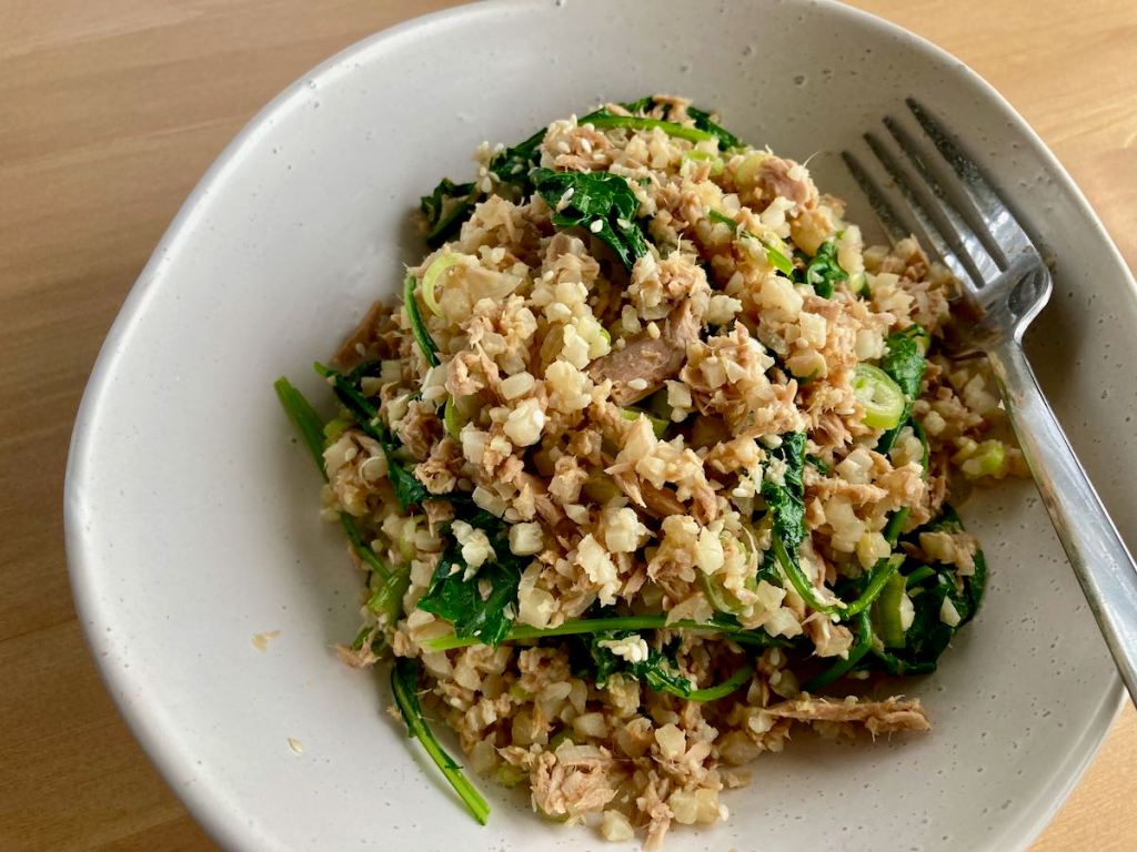Leftovers are not something that I am used to having, usually everything that gets cooked gets eaten right away, cauliflower rice is probably the exception to the rule. With a few pantry staples and leftovers, you can have this fresh, crunchy and very filling salad that is perfect for lunch