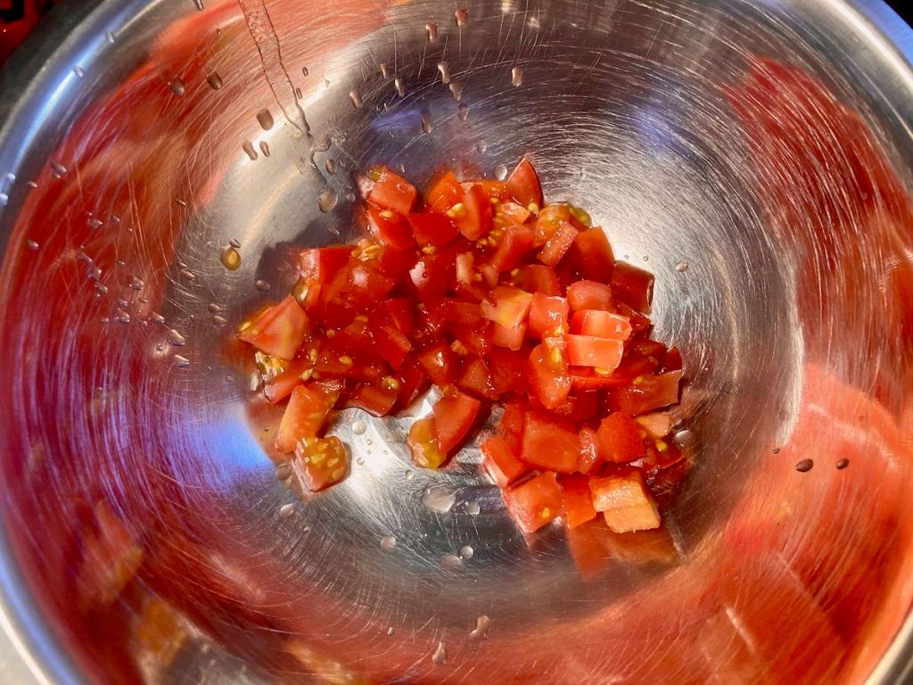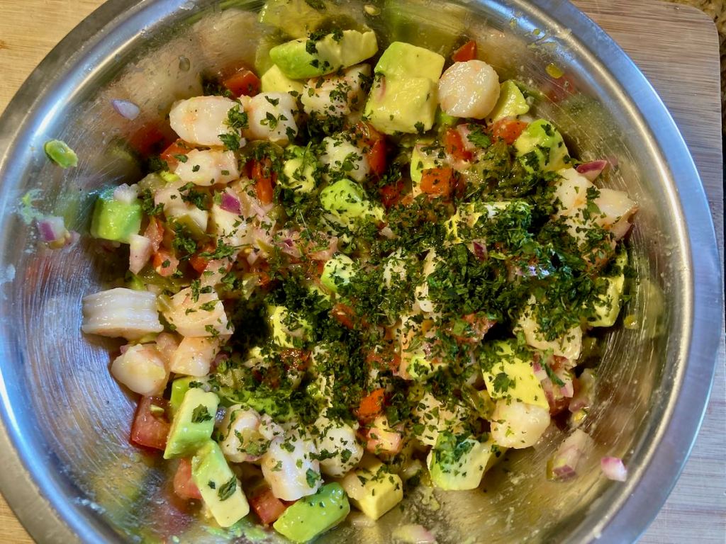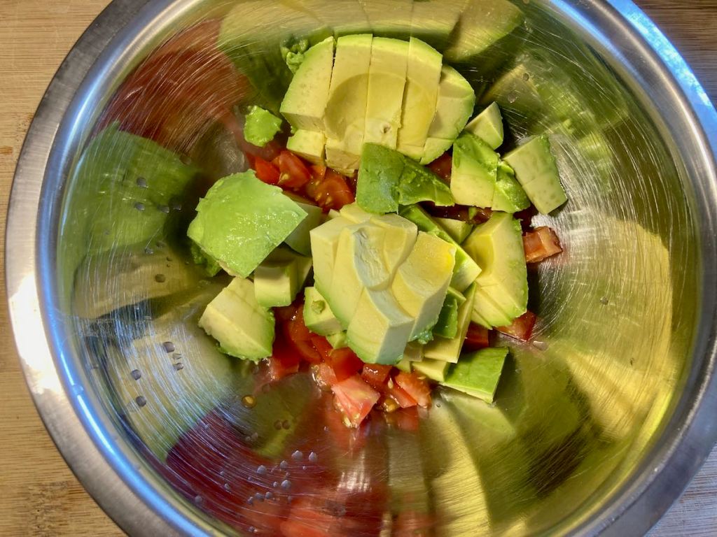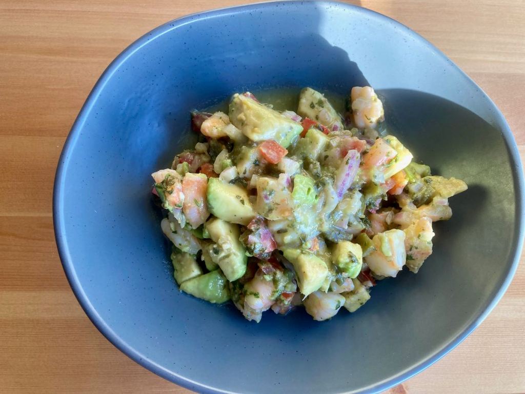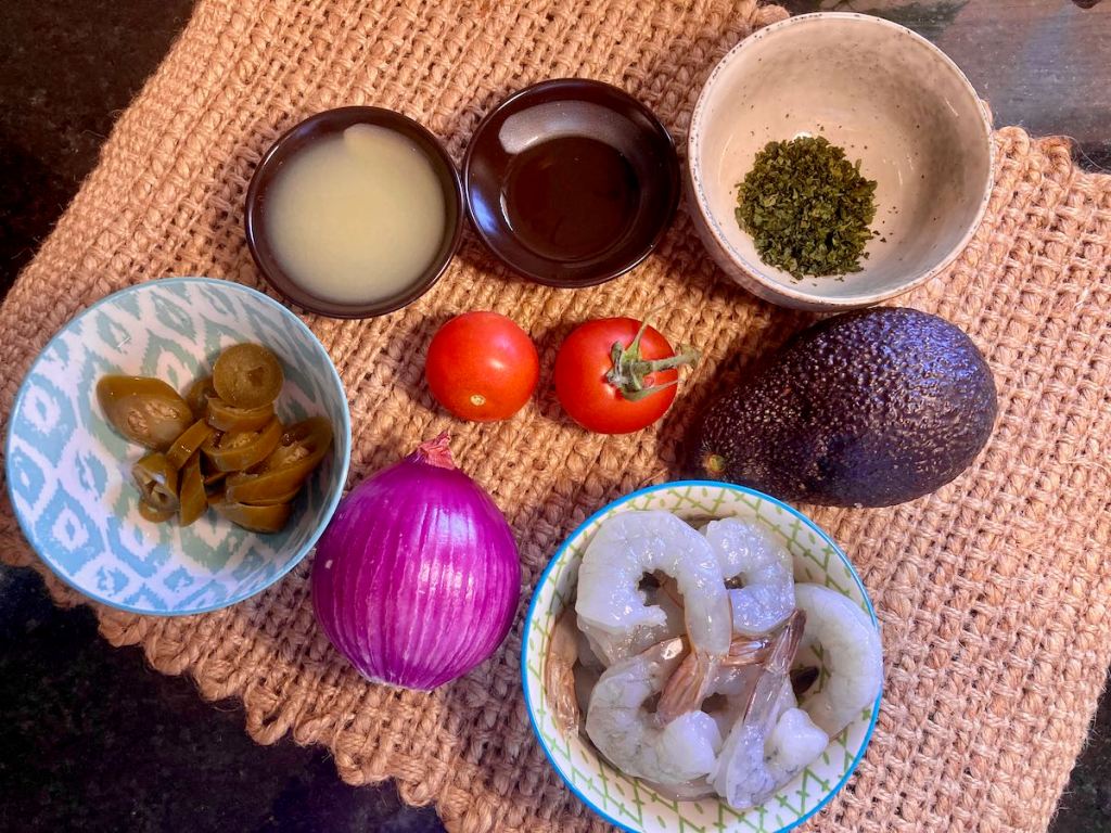 - In a large bowl, combine chopped prawns, avocado, tomato, jalapeño.