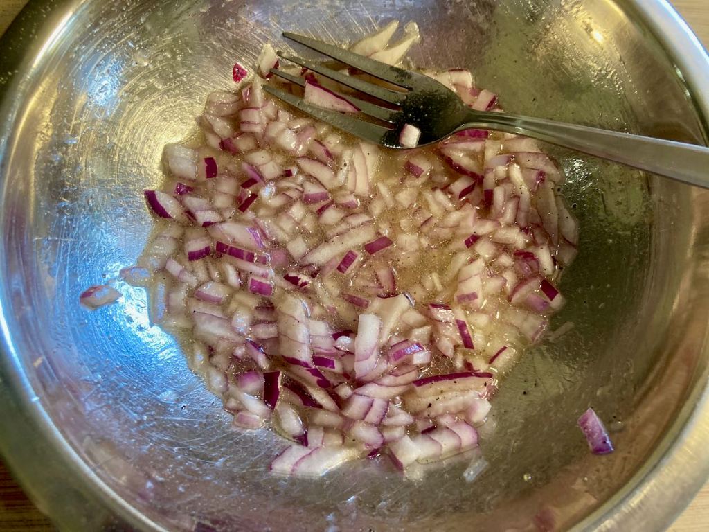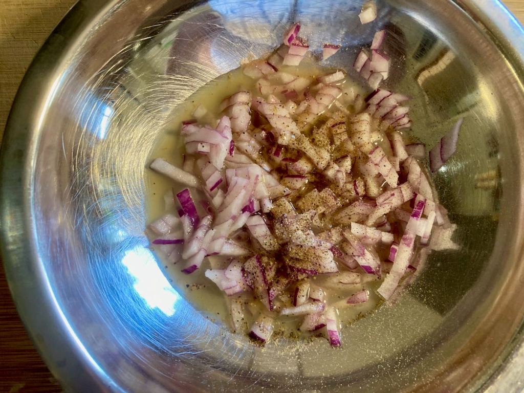 - Combine the red onion, lime juice, olive oil, salt and pepper in a small bowl.