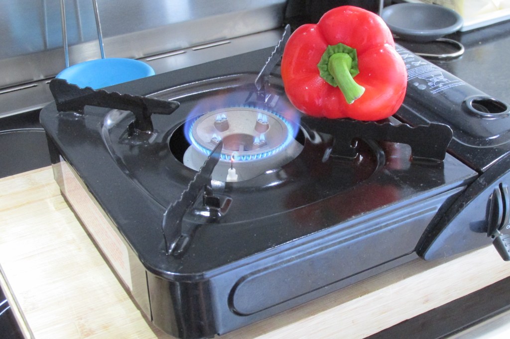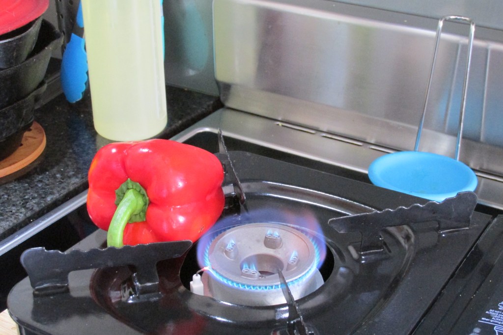 Place the pepper over the flame; I lean the pepper against the metal for pans.