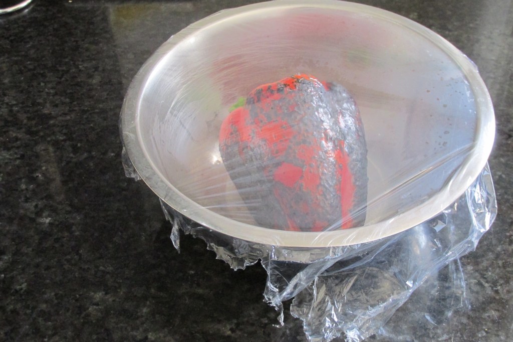 - When the pepper is charred take it off the heat, put them in a bowl, cover the bowl with cling film and let the peppers steam for 10 minutes
