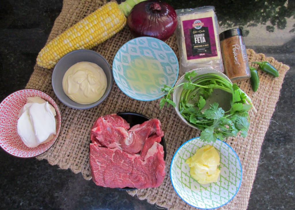 - Add the coriander, jalapeño and red onion to the corn and toss to mix. 11.To serve, plate up the corn salad and serve with the steak and crumbled feta on top.