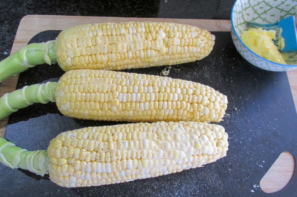 - Brush the corn with the butter and season the corn.