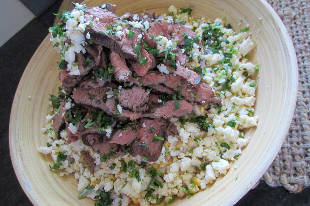 To serve, plate up the corn salad and serve with the steak and crumbled feta on top.