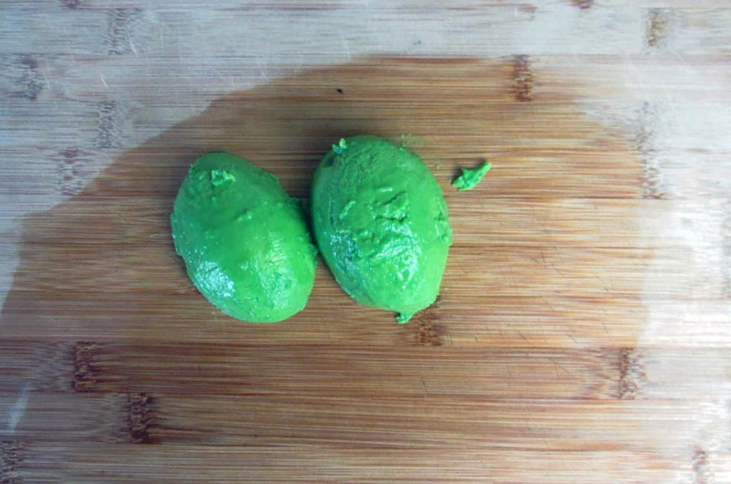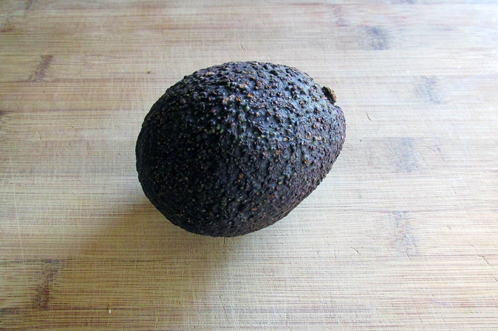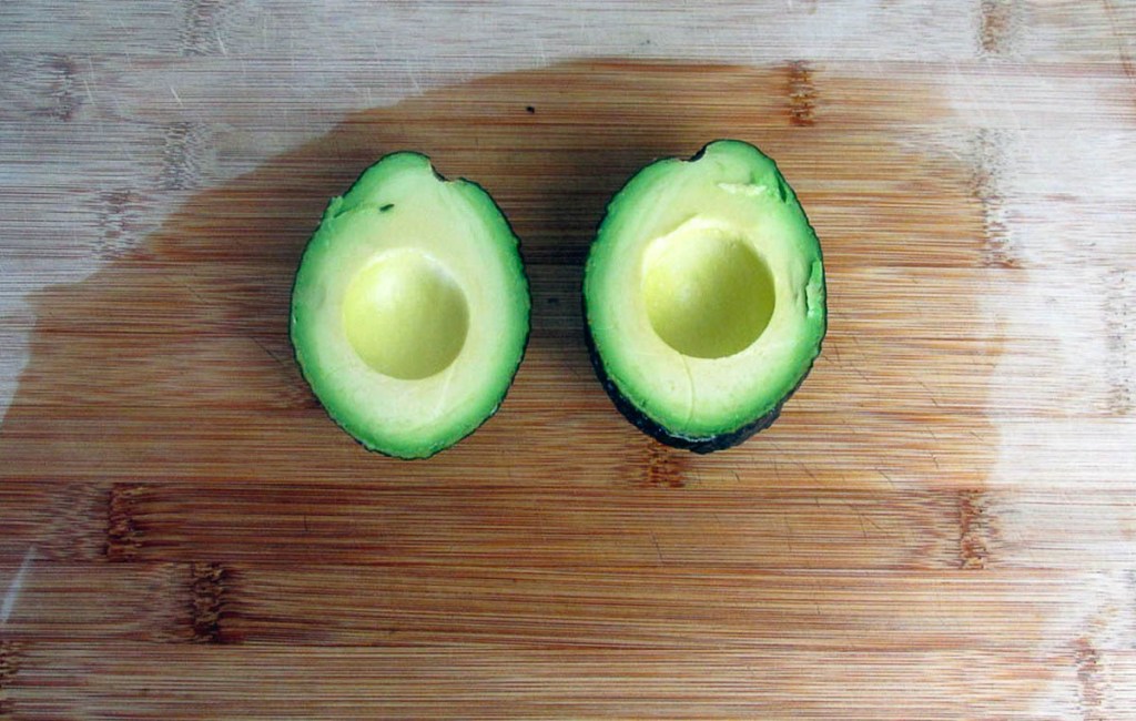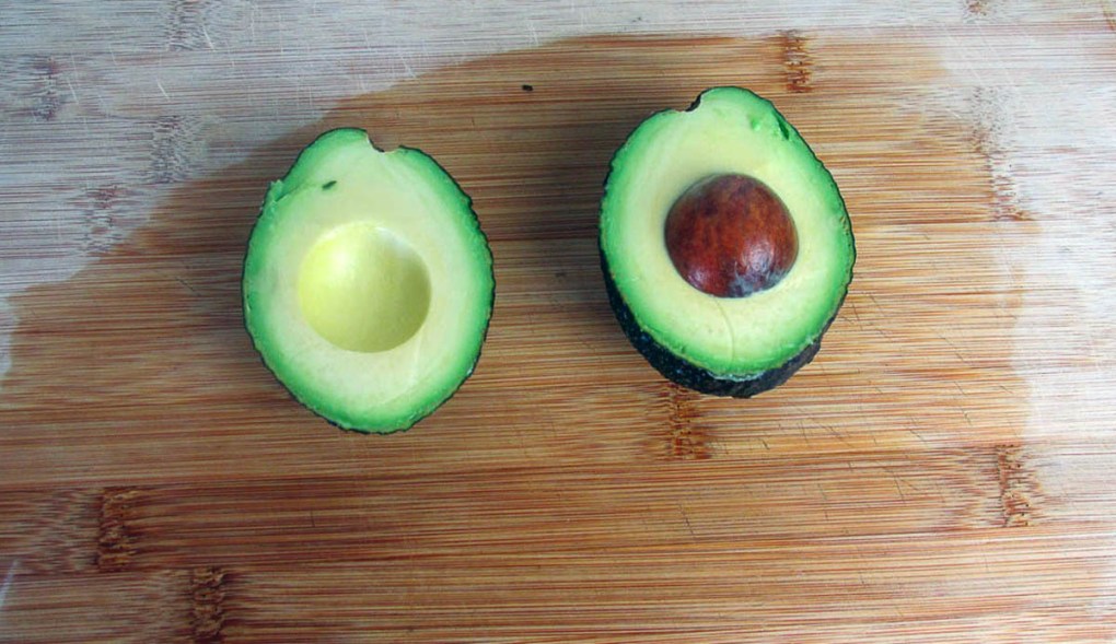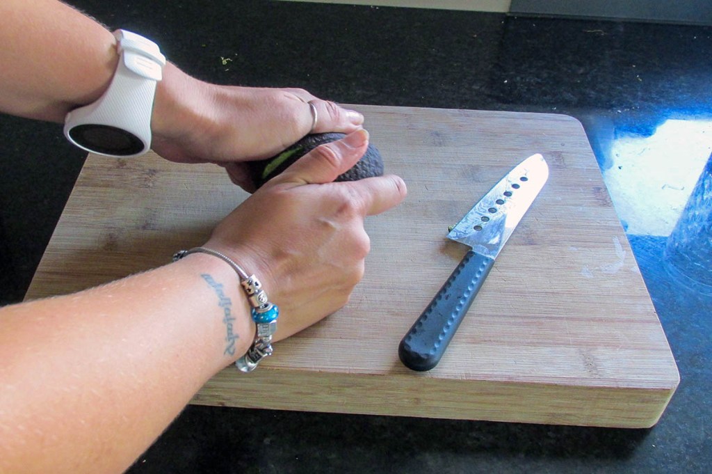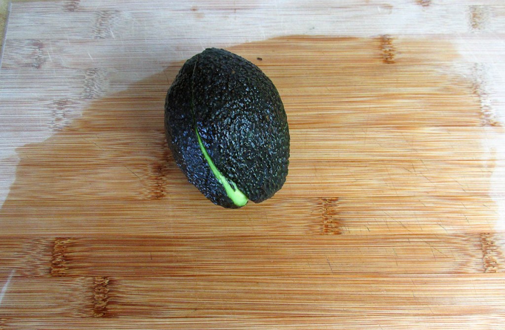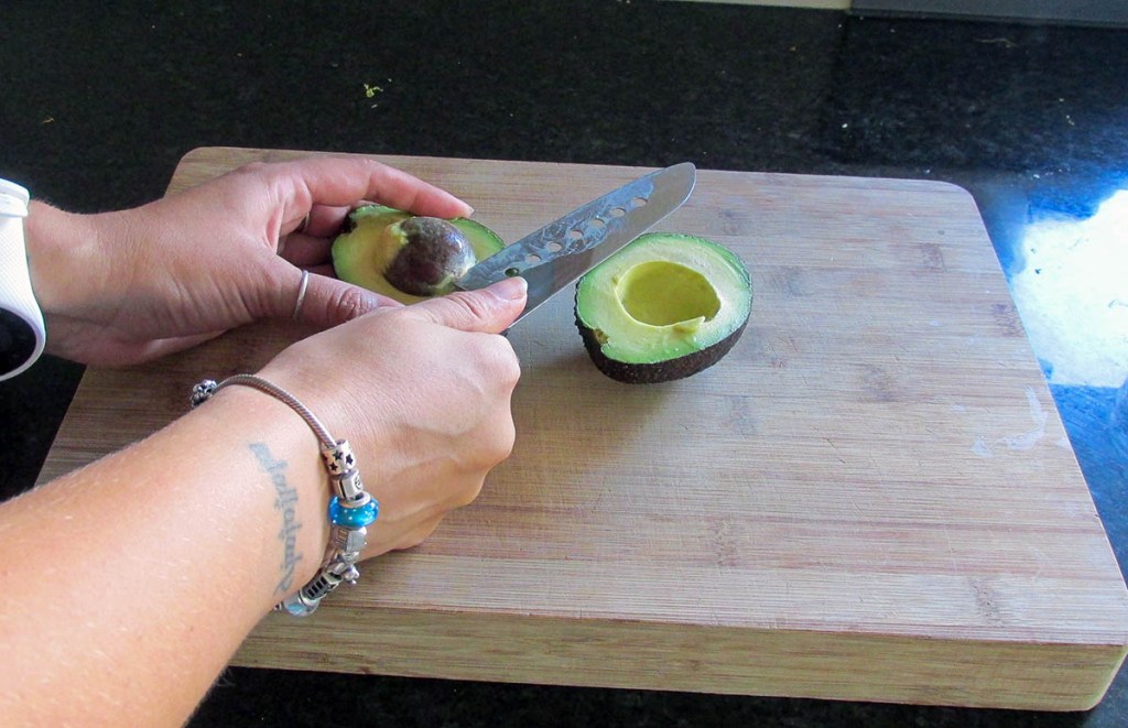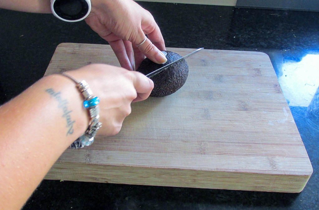 Take a medium-large knife and cut the avocado in half. The easiest way is to roll the avocado around the blade to get a clean cut in half