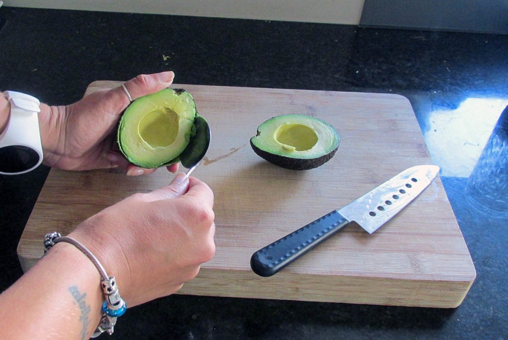 Take a tablespoon and run it around the inside of the skin to remove the avocado.