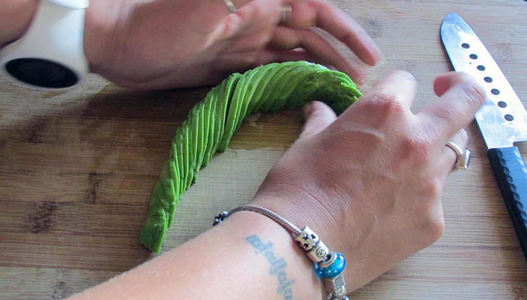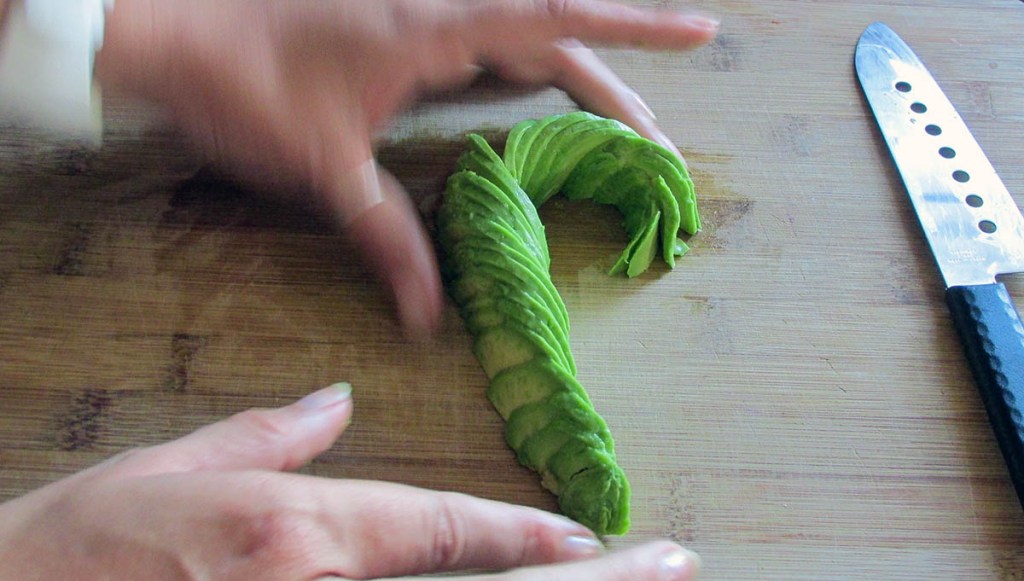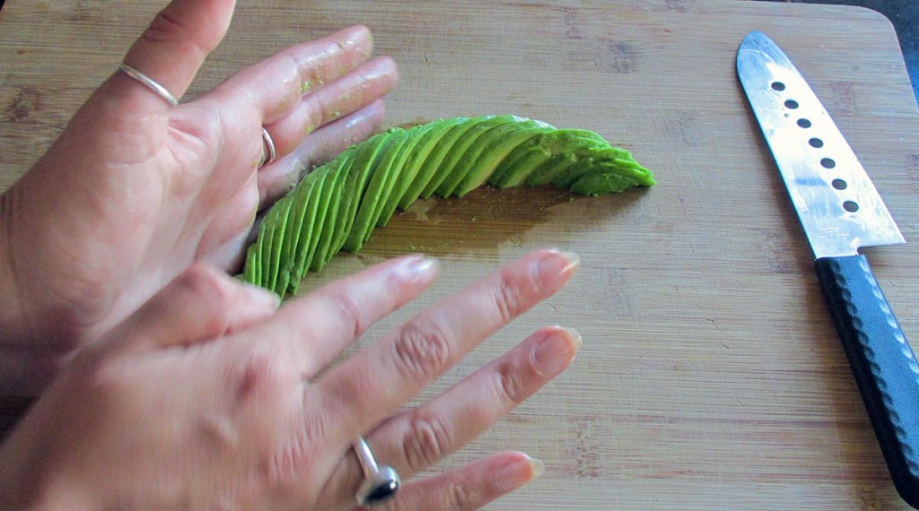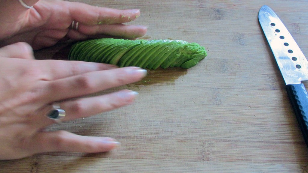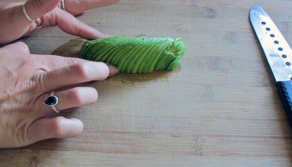 Place the avocado half on the board, so the length of the fruit is horizontal on the board