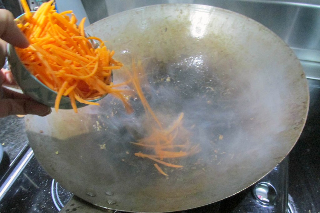 Add a tablespoon of oil to the wok. You don’t need a lot of oil but use one with a high smoke point.