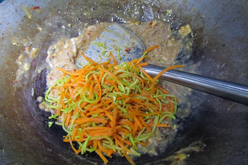 Add the faster cooking vegetables next such as mushrooms, bean sprouts and courgette. Keep the veg moving as it cooks, let these cook for 3 5 minutes.