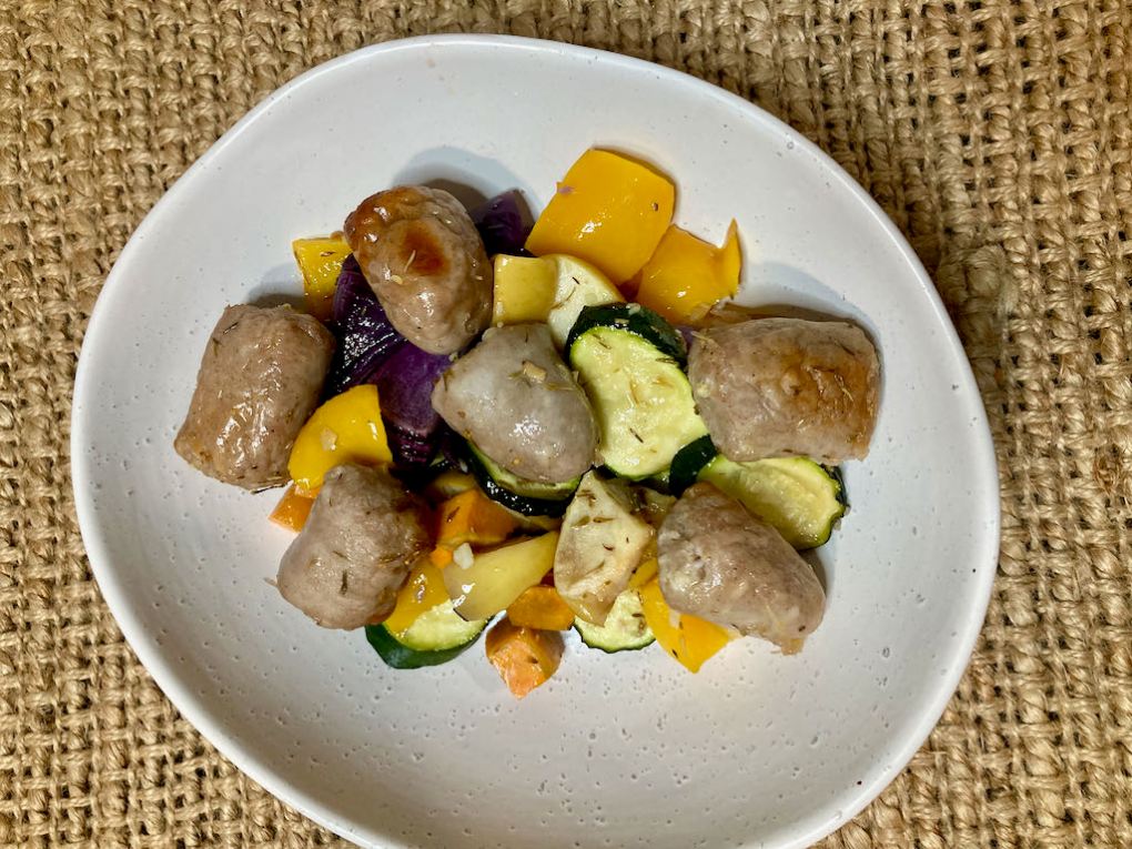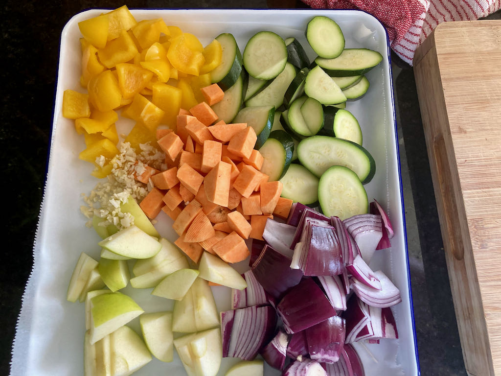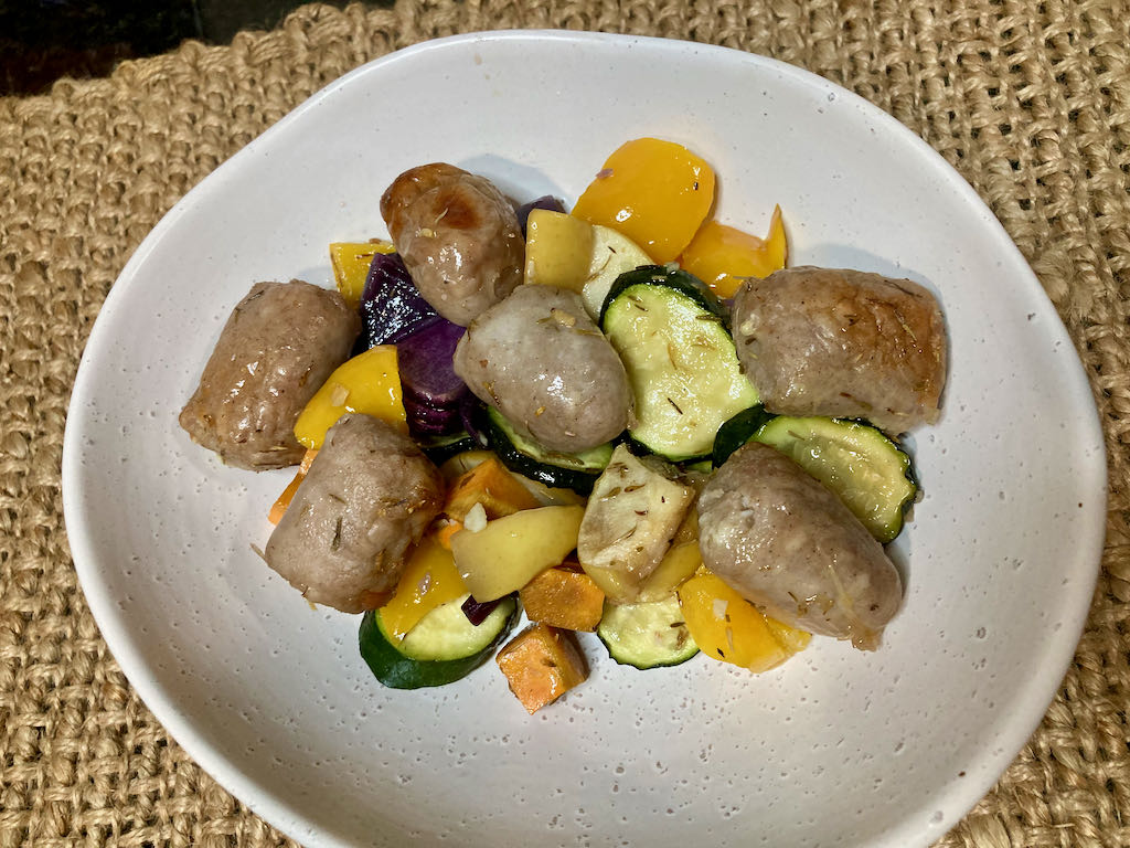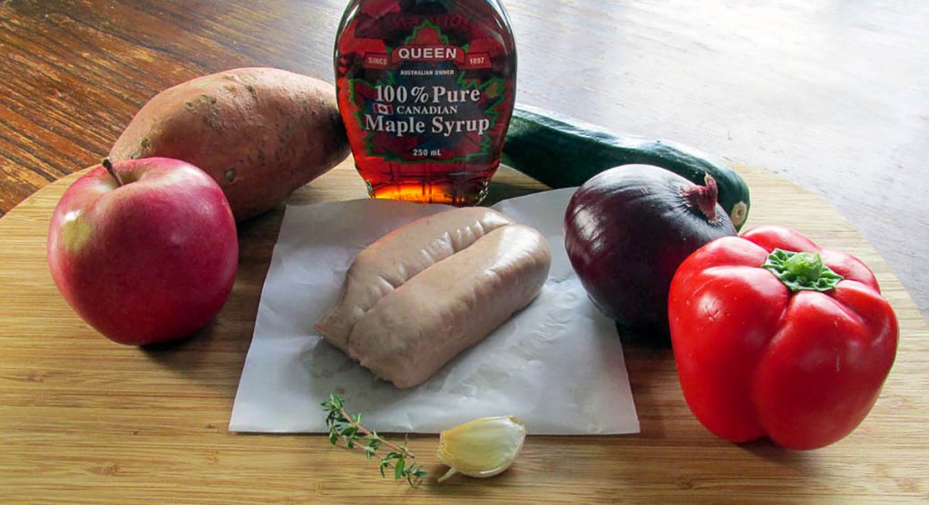 This recipe is one of the very first one-tray meals I made back when we started eating clean. I was big on throwing dinner in the slower cooker before heading off for a busy day at work, but it was always nice to have something a bit different on the weekends. The combination of tasty sausages and fresh vegetables always won on a Saturday afternoon after a day with the kids. We don’t spend our weekends running around playgrounds with the kids, but we still love a one-tray maple sausage roast.