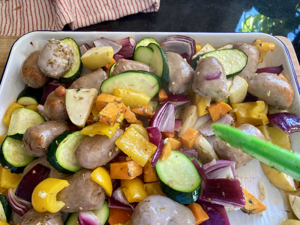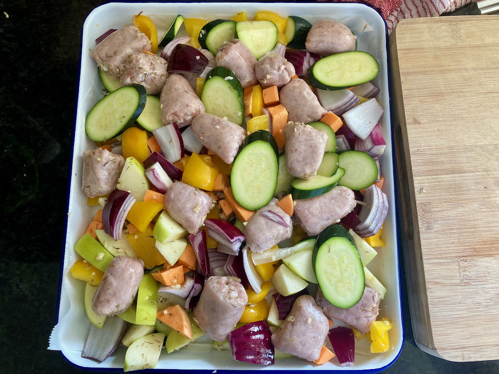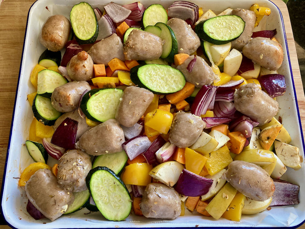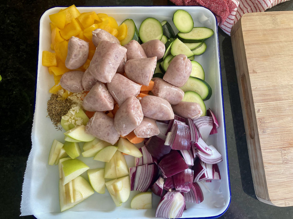 Early in 2021, I made the move to relocate and update my website; I’ve been making changes and improving all of the things as I go. This recipe is one of the many things I’ve tried to improve. This recipe is one of the first one-tray meals I came up with back in 2015. It has remained a regular meal that I crack out when we get some good quality sausages from Pokeno.