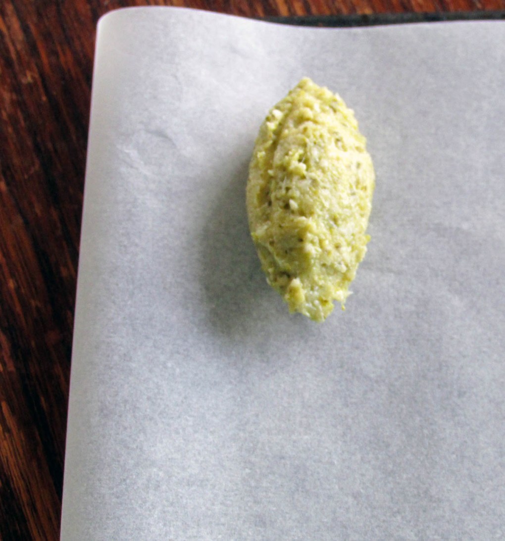 Repeat the transfer of the portion from one spoon to the other gently smoothing the mixture into an oval shape.