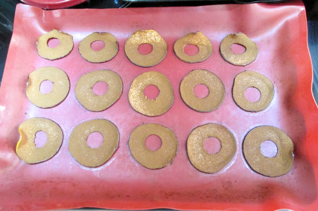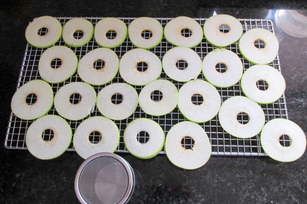 - Spread the apple slices on the baking trays, making sure you have no overlapping edges.