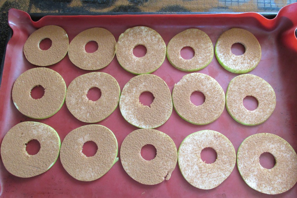 - Spread the apple slices on the baking trays, making sure you have no overlapping edges.