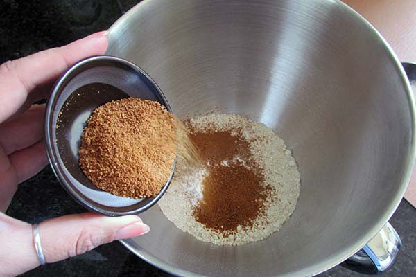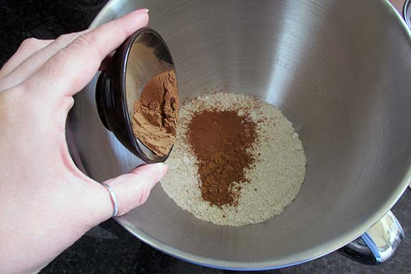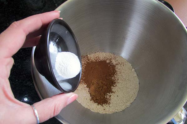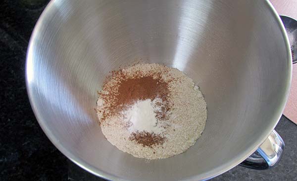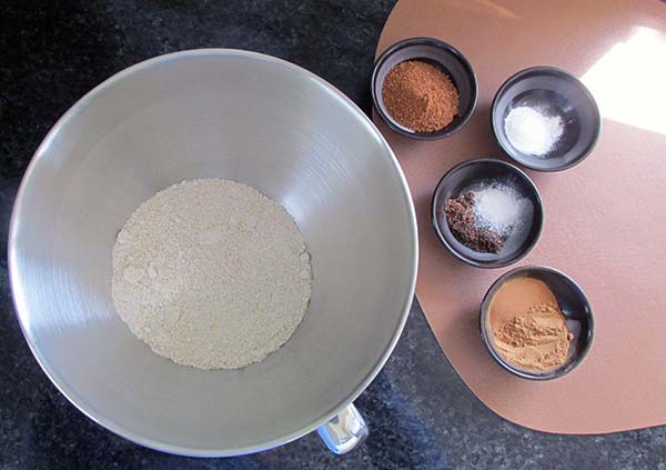 - In a bowl add the oat flour and mix in the baking soda, baking powder, coconut sugar, mixed spice, ground cinnamon and cloves.