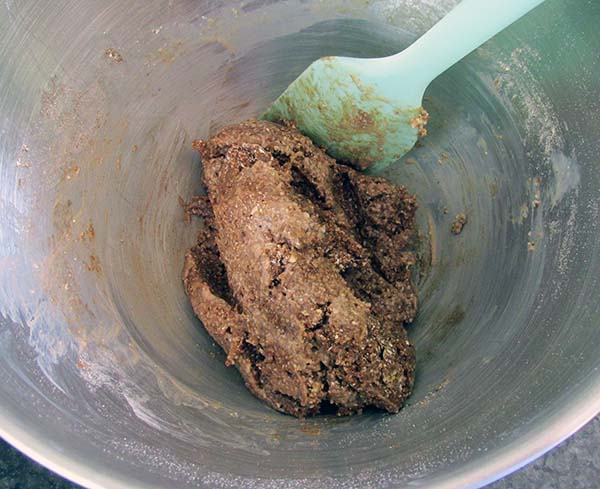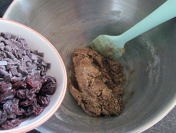 Add your wet and dry ingredients together and mix until combined and you have a sticky but not too sticky cookie dough.