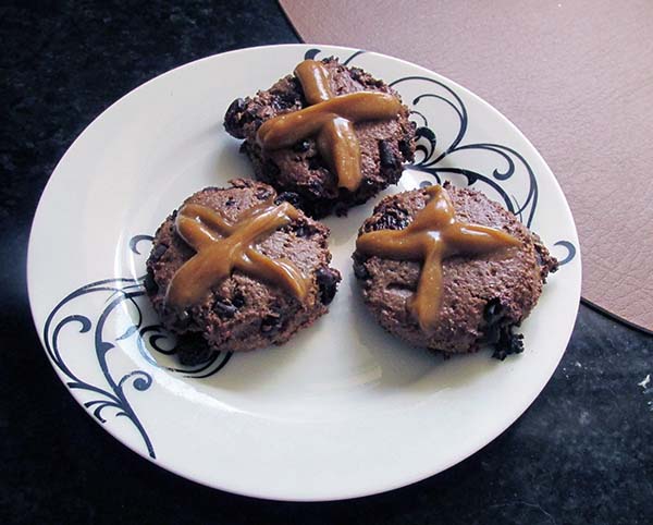 These cross-bun cookies have all of the fruity, spicy flavours of the traditional hot cross bun but in a gluten-free, sugar-free compact form. I make no claims about these cookies being healthy or good for you; they are just an alternative if you don’t want the pain and suffering that will come from those toasted hot cross buns.