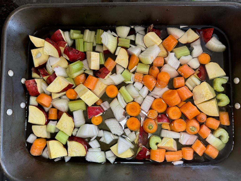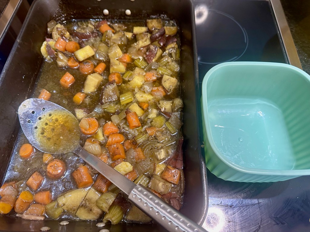 - Remove the vegetables from the tray and use the remaining liquid to make gravy.