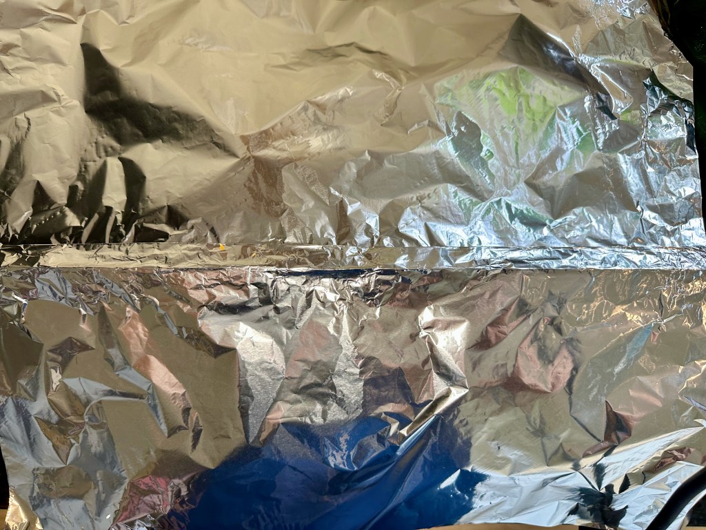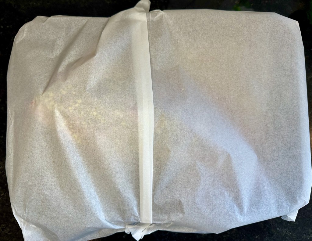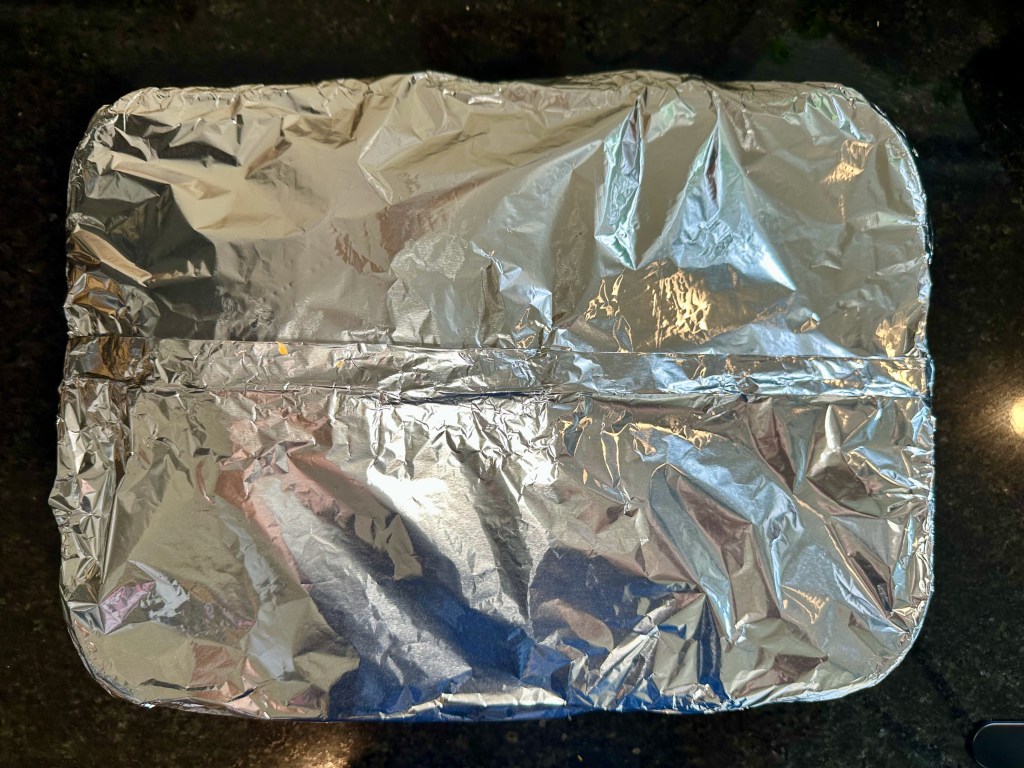 - Cover the roasting tin with baking paper and then foil, ensuring it is completely covered to keep the moisture in.