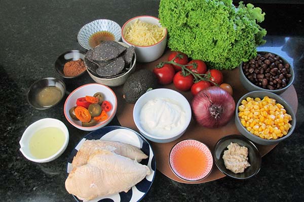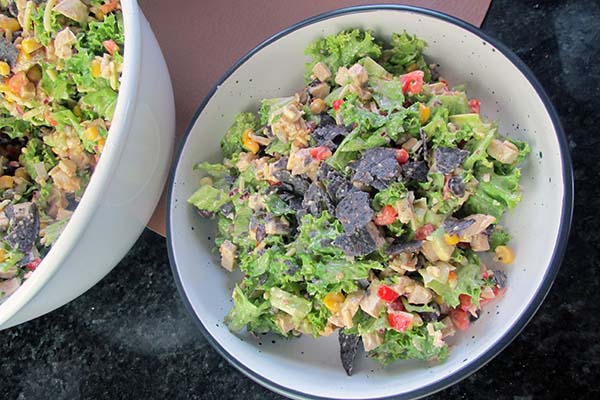 - Mix the lettuce, corn, beans, tomatoes, avocado, onion and cheese in a large bowl.