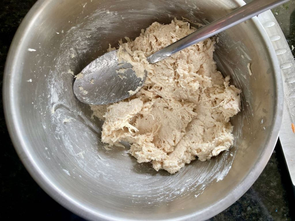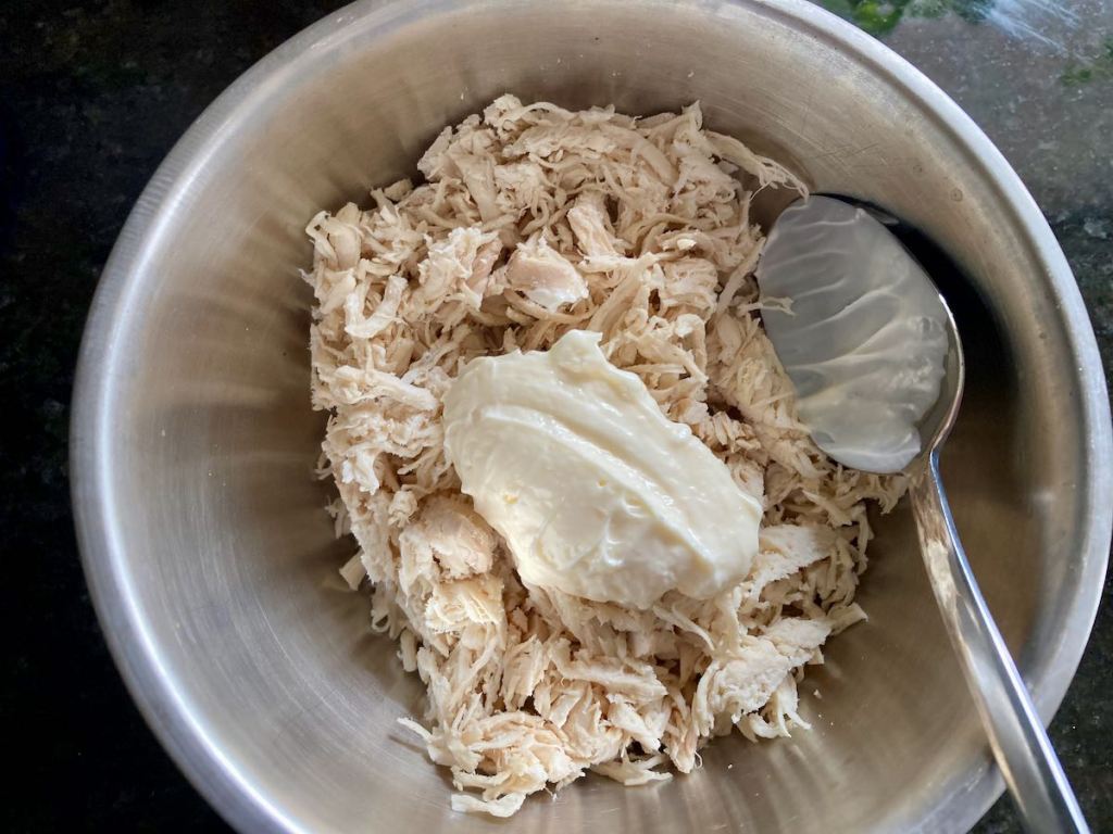 - Mix the chicken, chicken seasoning and mayo in a bowl to form a thick paste.