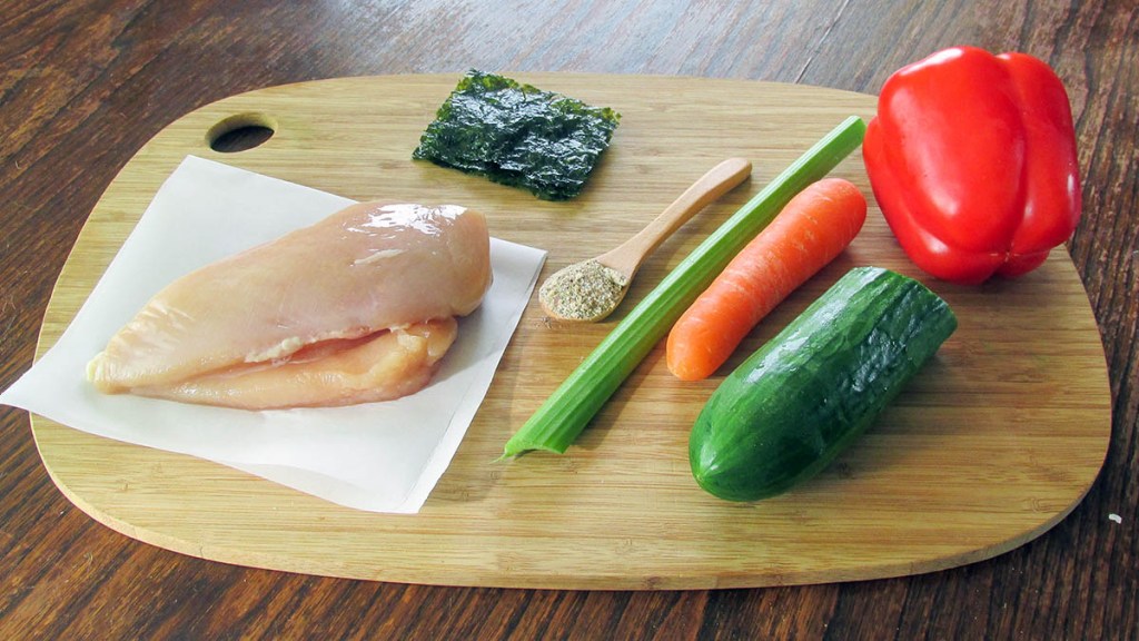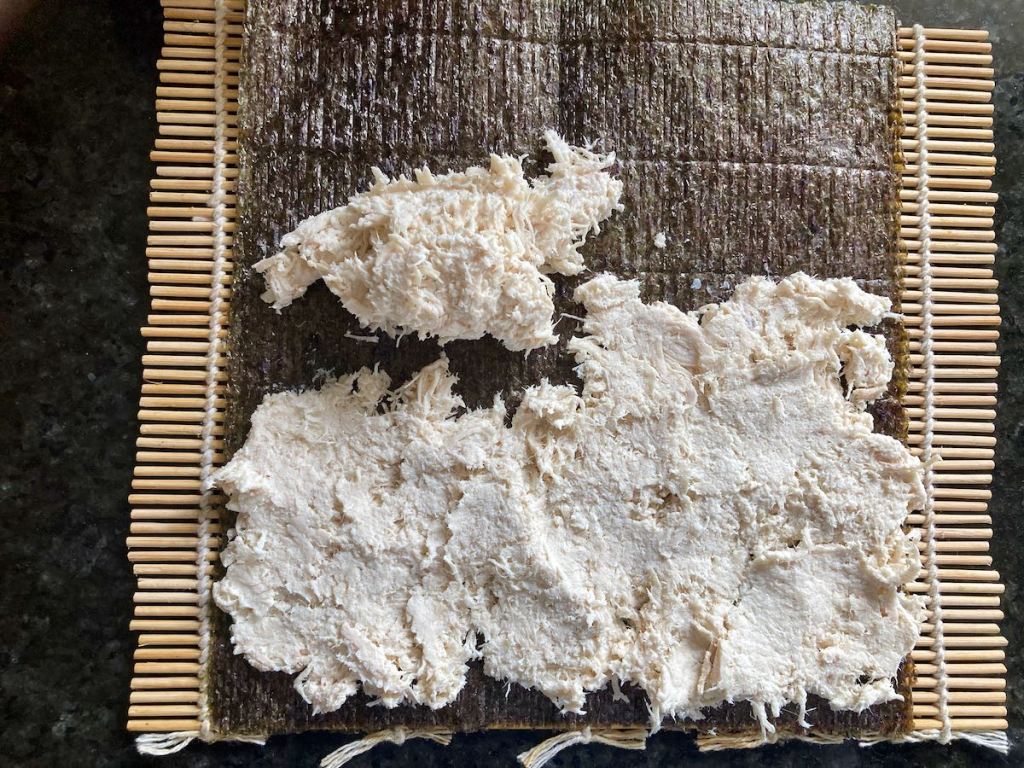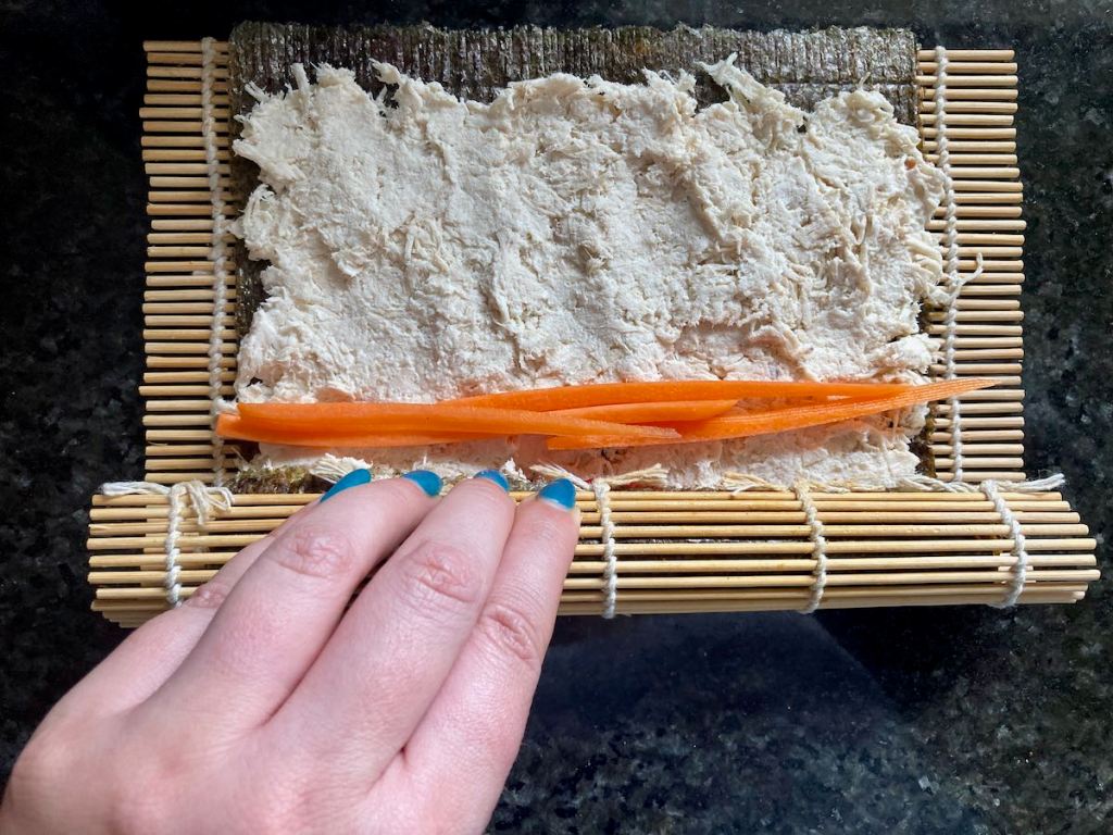 The best approach I have found when making no-rice sushi is swapping the rice for protein. For this recipe, I have swapped out the rice for cooked chicken, but it can also work with tuna, salmon, pork, or eggs. All you need to do is make sure the protein is mixed with something like mayo that makes it sticky enough to hold the sushi roll together. I love to add some seasoning to the protein to help add some flavour and a little kick.