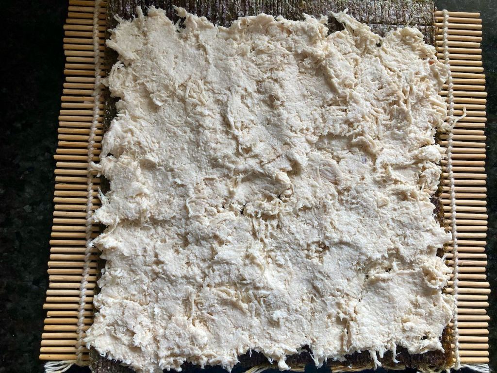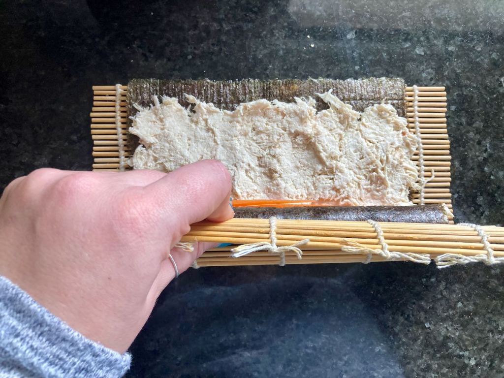 - Take the filling of choice and spread it out on the nori sheet.