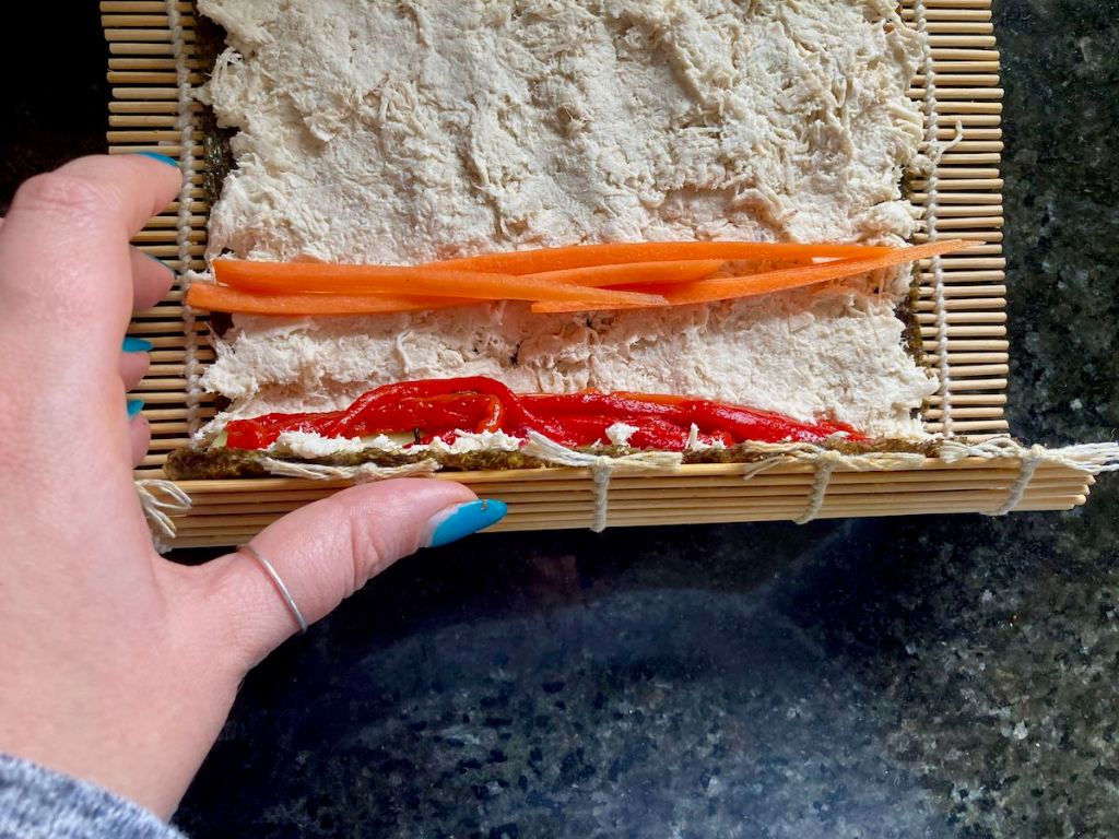Lift the edge of the mat up and use the mat to roll the edge of the nori over the first line of filling.